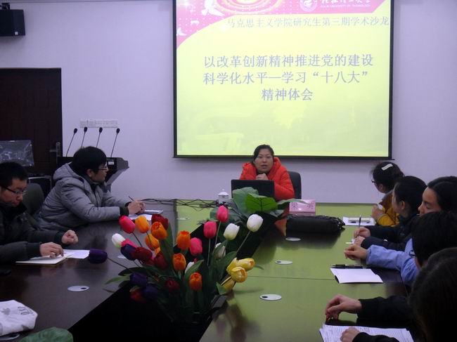 2012年12月30日,“以改革创新精神推进党的建设科学化水平——学习党的十八大精神体会”为主题的伟德bv1946研究生学术沙龙在雁山校区07415会议室举行。此次沙龙由学院中国特色社会主义理论教研室主任梁英副教授主持。