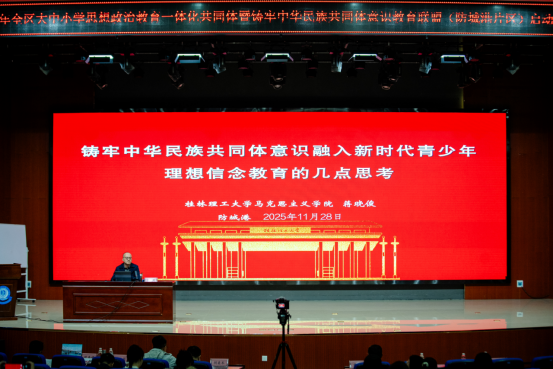 11月28日,全区大中小学思想政治教育一体化共同体暨铸牢中华民族共同体意识教育联盟(防城港片区)正式启动。伟德bv1946院长蒋晓俊、广西民族大学民族学与社会学学院民族学系主任胡美术、百色学院马克思主义学院黄修卓副教授、防城港市教育局副局长张培中、伟德国际victor1946统战部朱强,以及来自30所联盟单位的领导、思政课教师代表、德育工作负责人与业务骨干等100余人出席活动。