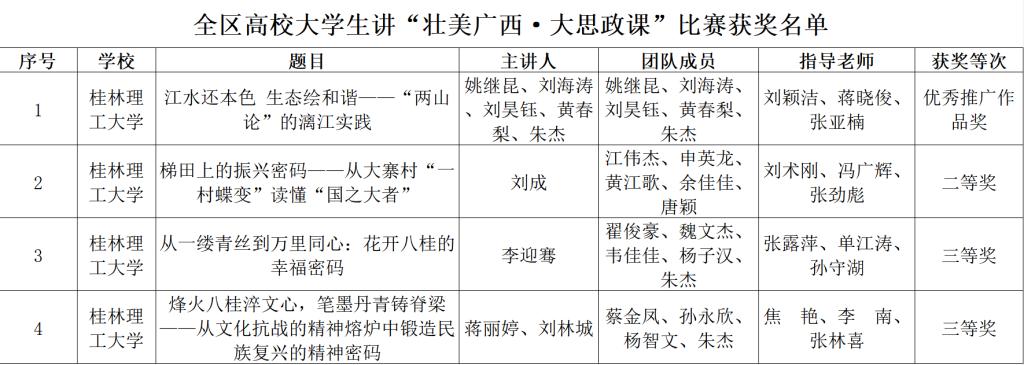 近日,由自治区党委宣传部、自治区党委教育工委、自治区教育厅联合主办,广西科技大学承办的2025年全区高校大学生讲壮美广西“大思政课”推选展示活动决赛在柳州圆满落幕。我院学子荣获4项奖项,创下学校参与该项赛事以来单次获奖数量的历史新高。
